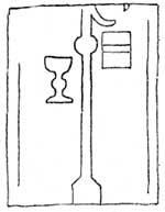 5. In an upright position, to the south of the west door, is a fragment of an incised grave cover. As the symbol on the dexter side of the cross-shaft is a chalice, and on the sinister side an open book, this is doubtless the memorial of a former vicar of the church. The work is of 14th century character, and similar in detail to other stones in the district.