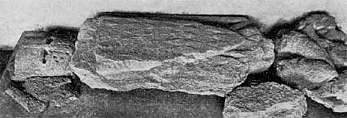 This effigy, which now lies at the east end of the south aisle, though in poor condition is of considerable interest. The head and shoulders have disappeared entirely. The hands, which are joined in prayer, are clothed in mail mittens fastened with cords tied at the wrists. The sword-belt is much narrower than is usual later, and is fastened to the scabbard at two points, a method which though later than the attachment at one point, is earlier than the interlocking-thong principle. The quillons of the sword are long and straight and the hilt is surmounted by a pear-shaped pommel. The surcoat is short and only split up the front a matter of six inches, displaying the hauberk beneath it, the latter reaching down almost to as low a point as the surcoat. The legs are crossed5 and the feet rest on a lion. No knee-caps are worn, but straps are fastened round the leg below the knee much after the fashion of the effigy ascribed to William Longsword at Salisbury, which has several features in common with this effigy. The purpose of these straps was to lesson the drag of the heavy chain-mail chausses, an inconvenience which was afterwards obviated by dividing them into two separate gannents, termed chausses and chaussons respectively.6