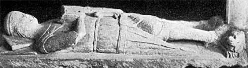 This effigy, the northernmost of the two free-stone effigies in the south aisle, is so worn that it is difficult to speak in anything but general terms. The head rests on a double cushion, and the metal skull-cap is secured by a plain fillet. The hands are joined on the breast in prayer. The sword has a round pommel and the quillons slope slightly downwards, the attachment to the sword-belt is somewhat uncertain, but seems to have been by interlocking-thongs. The shield, twenty-eight inches in length, is worn low down on the left side and bears no charge. The knees are protected by plain caps, and though both feet have gone, the prick-spur remains on the right heel.
