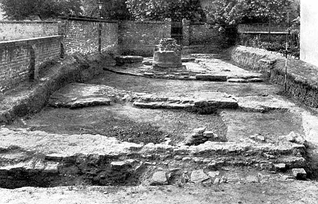 During the excavations in the garden at the corner of Priory Street and Old Church Street, it was discovered that the two piers mentioned in the preceding paragraph had been built upon a semi-circular foundation 7 feet wide, with an internal diameter of 26 feet. Across the diameter of the semi-circle was another foundation-wall also 7 feet wide. Such foundations have been found across the apsidal ends of other churches, but their purpose is hard to discover. It was obvious that other piers had existed forming a semi-circular arcade, the two ends of which extended in a westerly direction along the main body of the church after the manner of the arcades of St. Bartholomew’s, Smithfield, and of the chapel in the keep of the Tower of London.12 Two trenches driven into the next garden proved this.13 The chamfered base of a pier of the north nave arcade and the foundations of the south nave arcade were discovered in this garden.