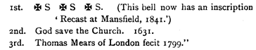 A fourth bell was added in 1841, having this inscription:— " Jesu Salvatori dedicatum munus Henrici Coape Samueli Matthews et Uria Wood gentrosonim civium 1841."