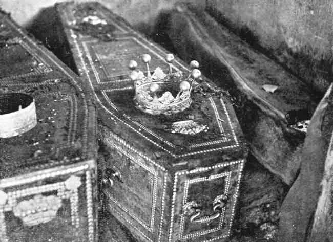 General view of the interior of the Vault, showing the coffins of Byron (left), Lady Lovelace (centre),, and the leaden shell of Frances, the second wife of the fourth Lord Byron (right).