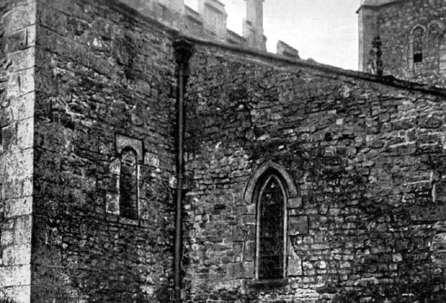 EXTERIOR N.-E. ANGLE, SHOWING LANCET WINDOW OF BECKET CHAPEL AND BLOCKED NORMAN CHANCEL WINDOW.