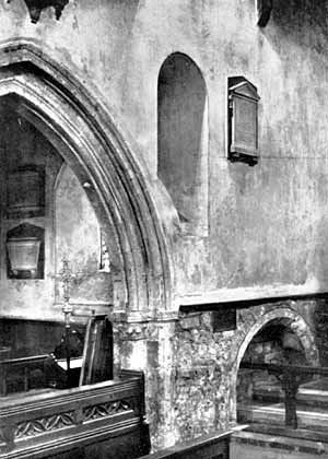 Opposite the arch, in the south wall, is a double recess, with arched heads and a central dividing shaft, which may have been either a double piscina for Mass ablutions, or a combined piscina and aumbry. Which it was, it is impossible to say, as it seems to have been re-silled in the restorations of last century, and has lost its drain or drains.