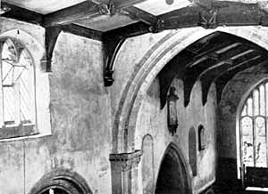 The chancel arch is a surprisingly unsatisfactory piece of work for its time. It was substituted about 1425 for the lower round-headed Norman arch, which would have cut into the line of vision of the new east window then put in, and would, moreover, have left a tall, ugly wall-space between chancel and nave on the heightening of the latter by the addition of the clerestory. The Perpendicular masons insisted on showing off their enlarged windows properly ; and they seem to have been more intent on this display than on preserving the architectural amenities and proportions, for the members of their arch do not correspond to the abacus tables, which are consequently left high and dry at the sides, with the side-shafts of their responds supporting nothing.